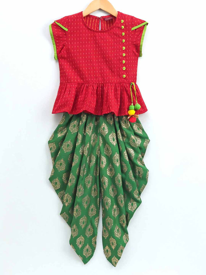 Short Sleeves Potli Button Decorated Top With Dhoti - Red & Green