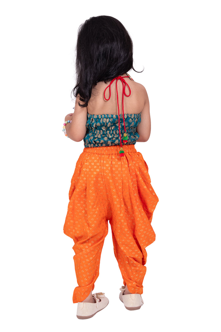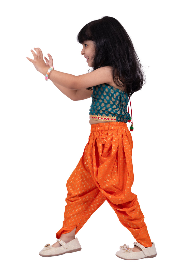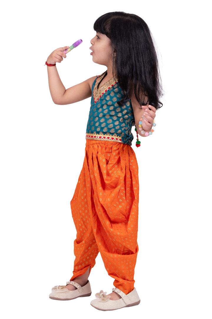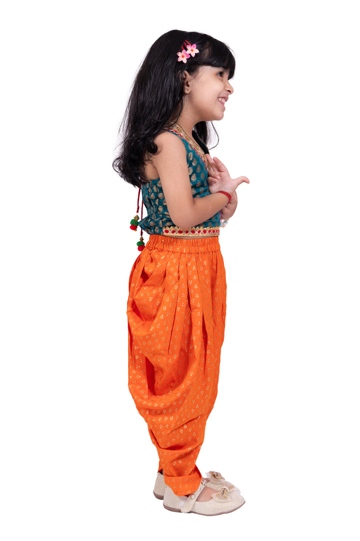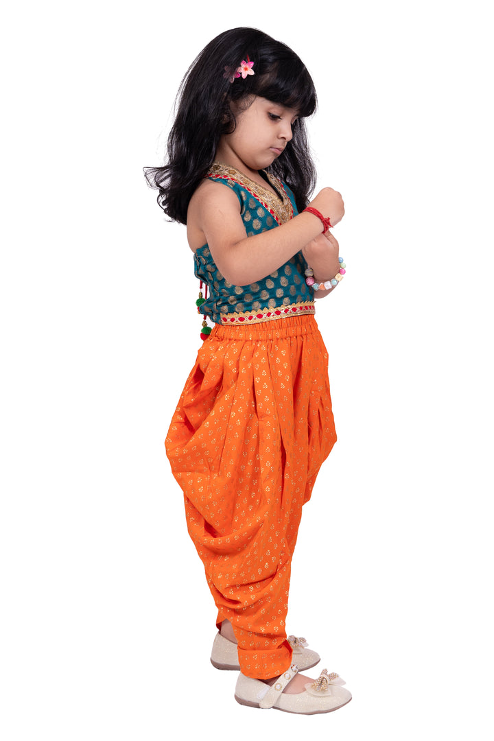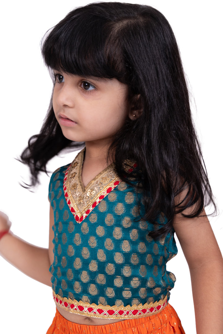 Twisha Girls Brocade sleeveless Embellished Top With Dhoti-Green & Orange