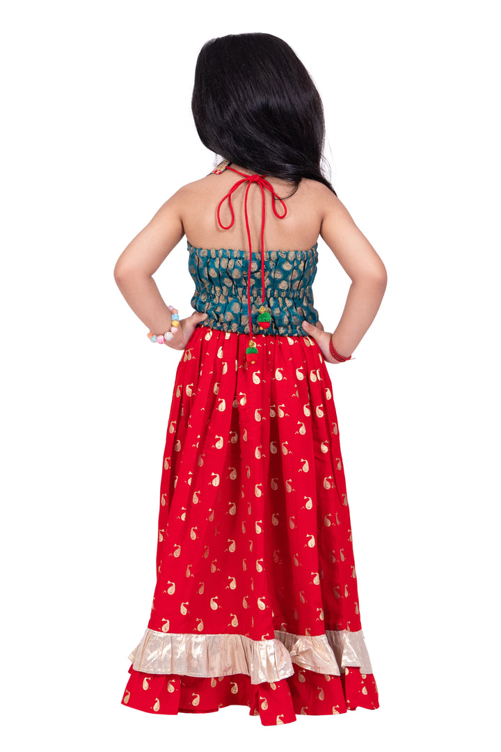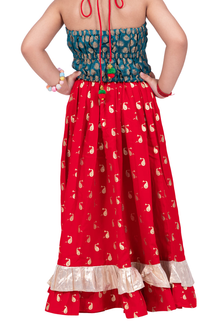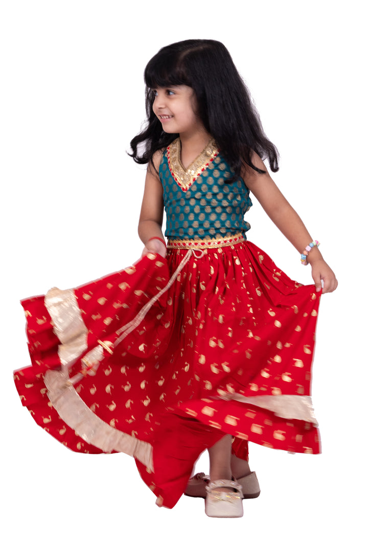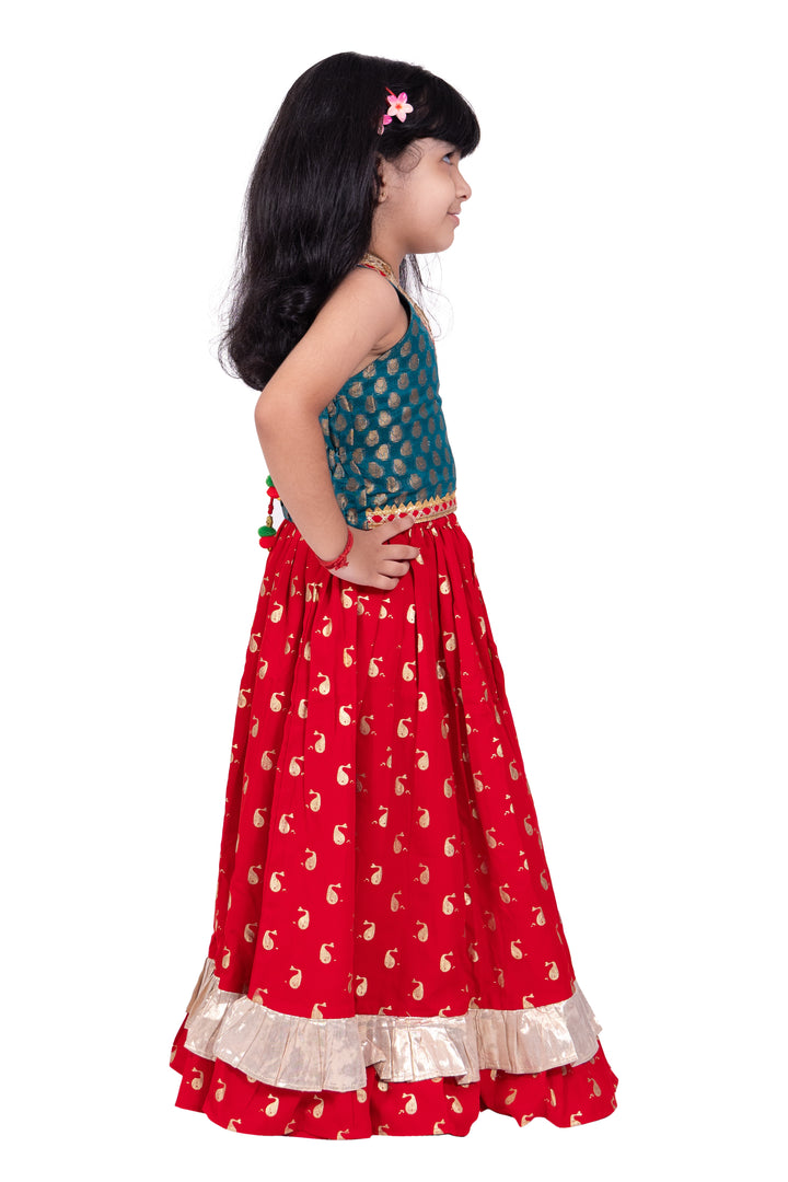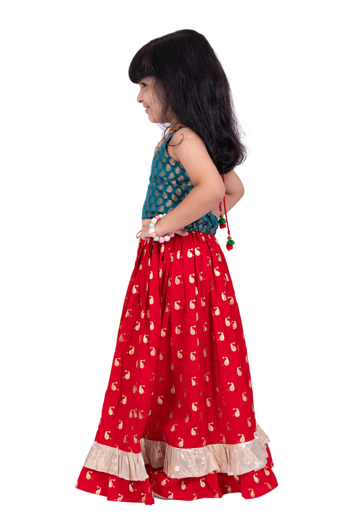 Twisha Girls Brocade sleeveless Embellished Top With Lehenga-RamaGreen & Red