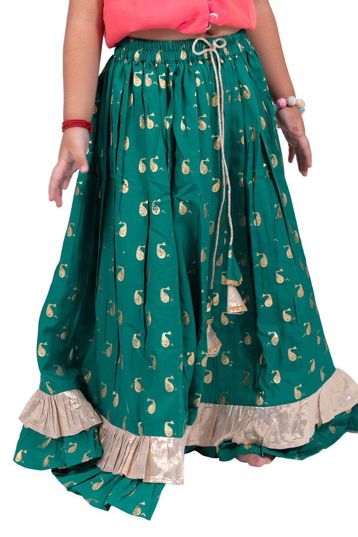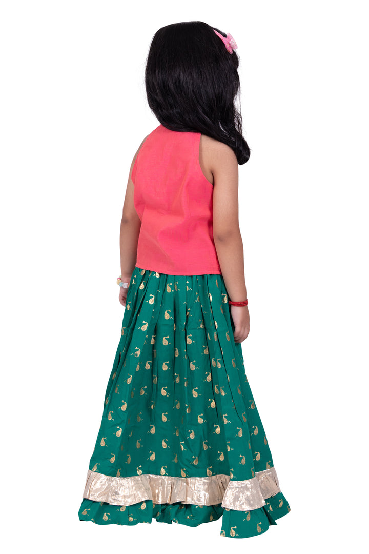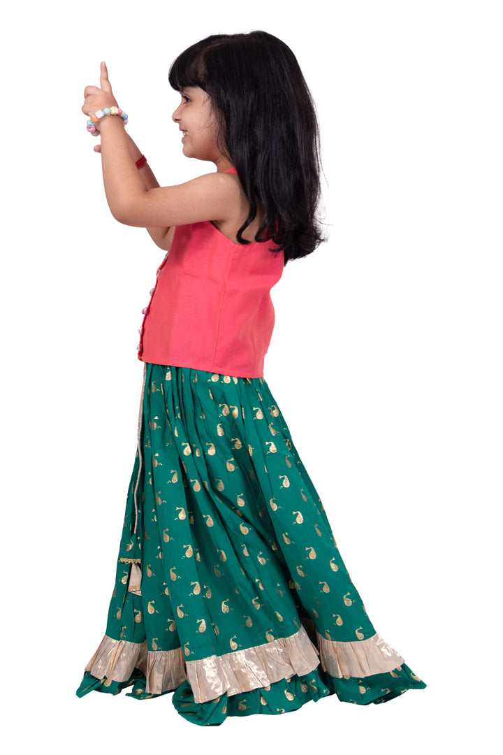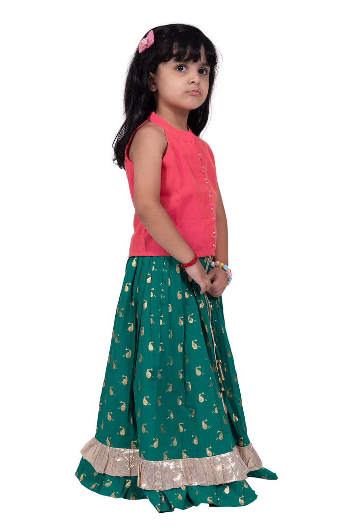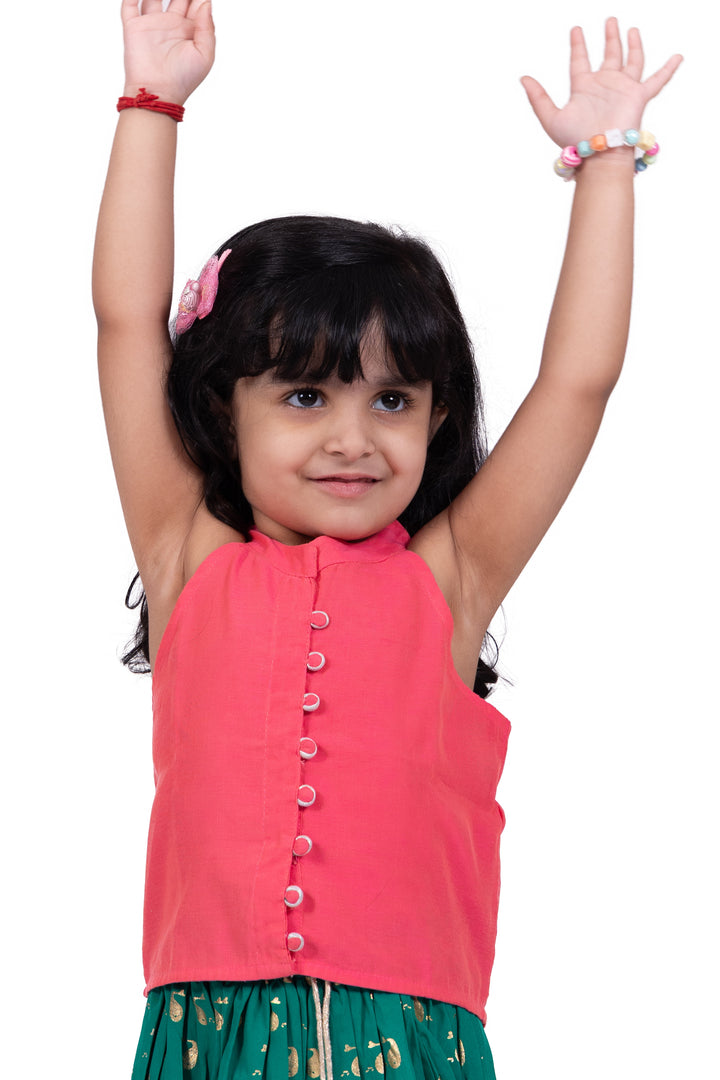 Twisha Girls Chanderi Sleeveless Solid Top & Printed Lehenga-Coral & Green