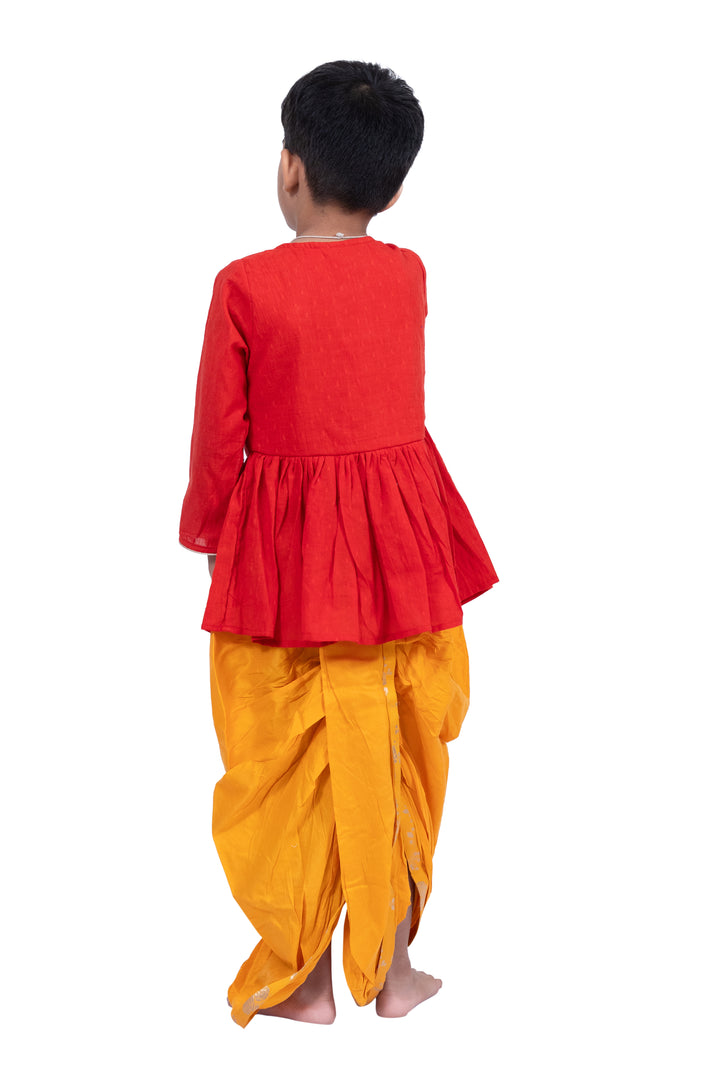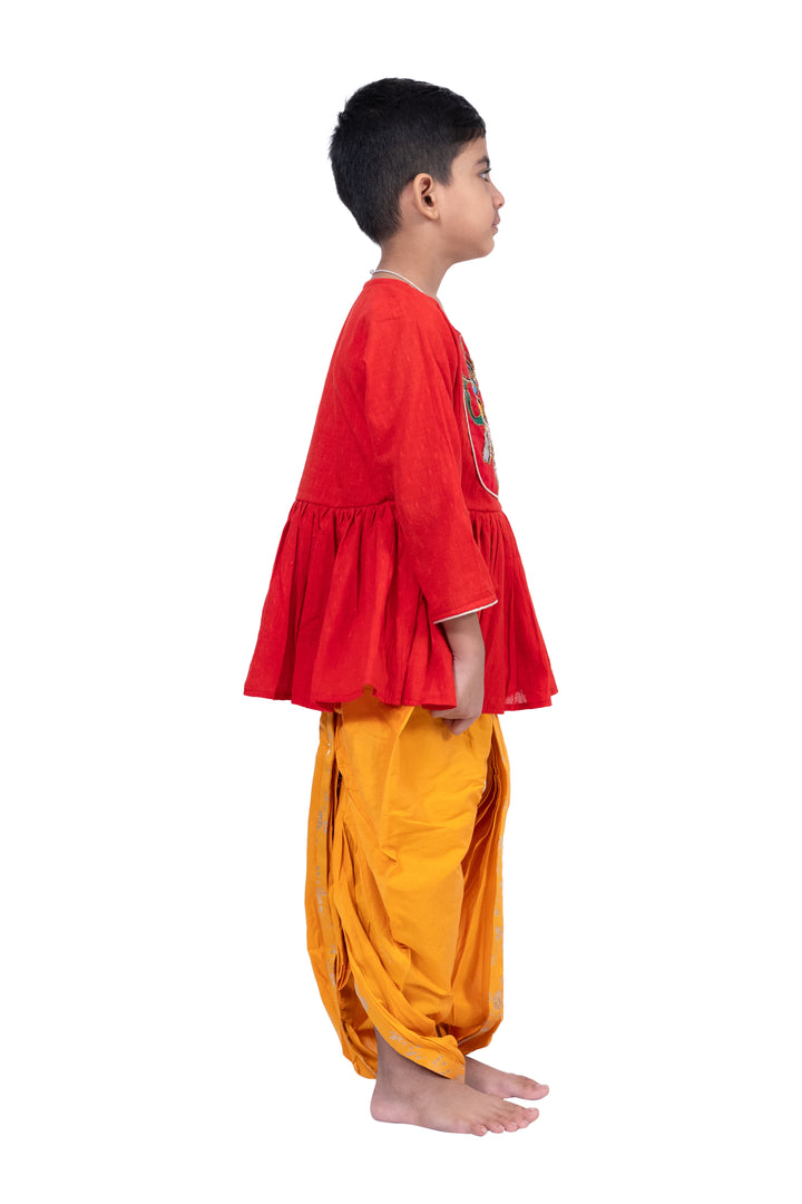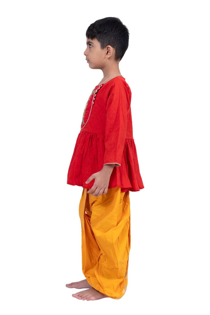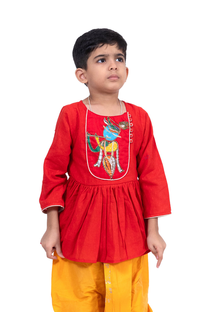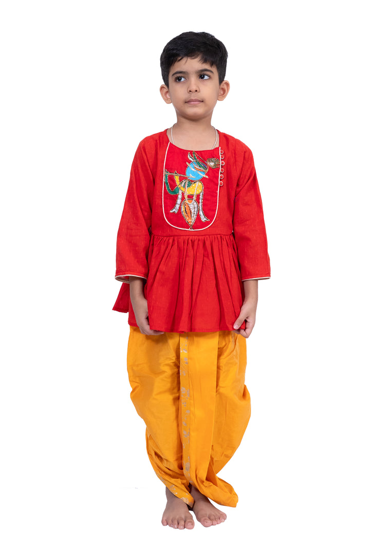 Twisha Boys Cotton 3/4Sleeves Krishna Printed Kurta With Dhoti - Red & Yellow