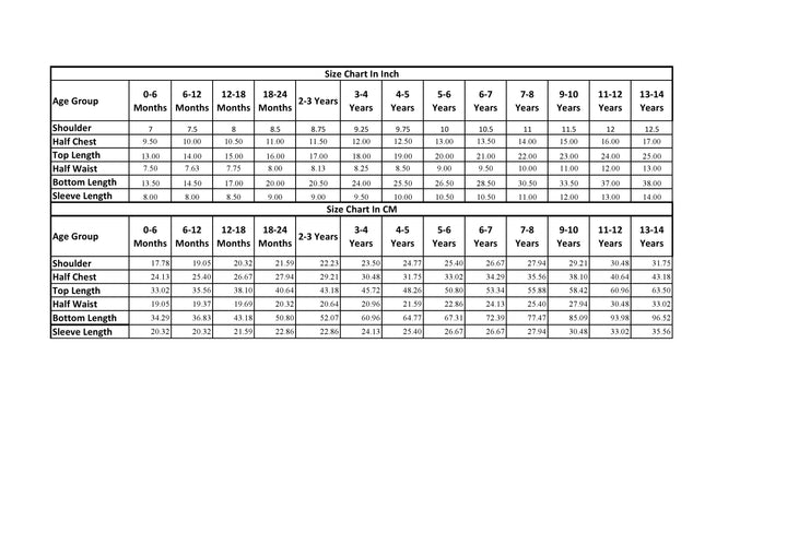 0-6M, 6-12M, 12-18M, 18-24M, 2-3Y, 3-4Y, 4-5Y, 5-6Y, 6-7Y, 7-8Y, 9-10Y, 11-12Y, 13-14Y |