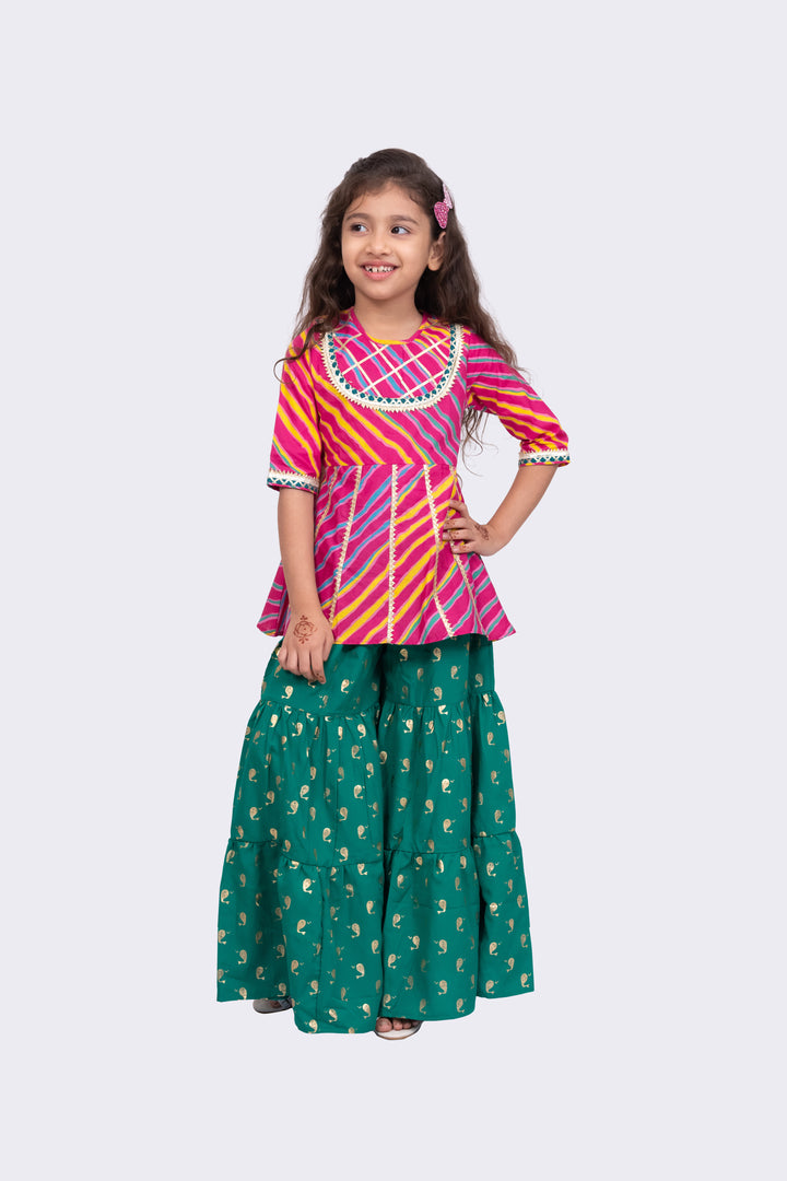 Twisha Girls Cotton 3/4Sleeves Leheriya Printed Top with Sharara - Pink & Green