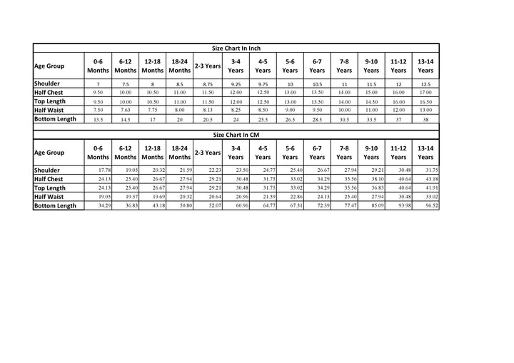 0-6M, 6-12M, 12-18M, 18-24M, 2-3Y, 3-4Y, 4-5Y, 5-6Y, 6-7Y, 7-8Y, 9-10Y, 11-12Y, 13-14Y |