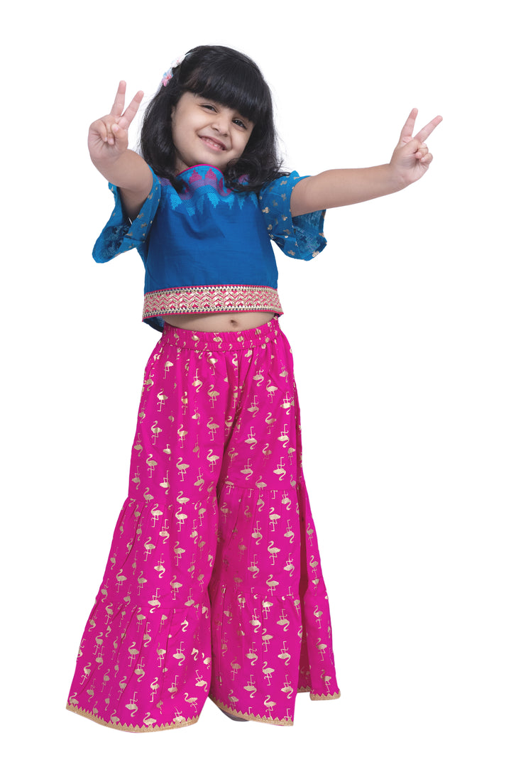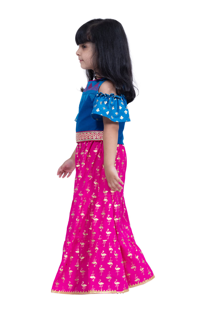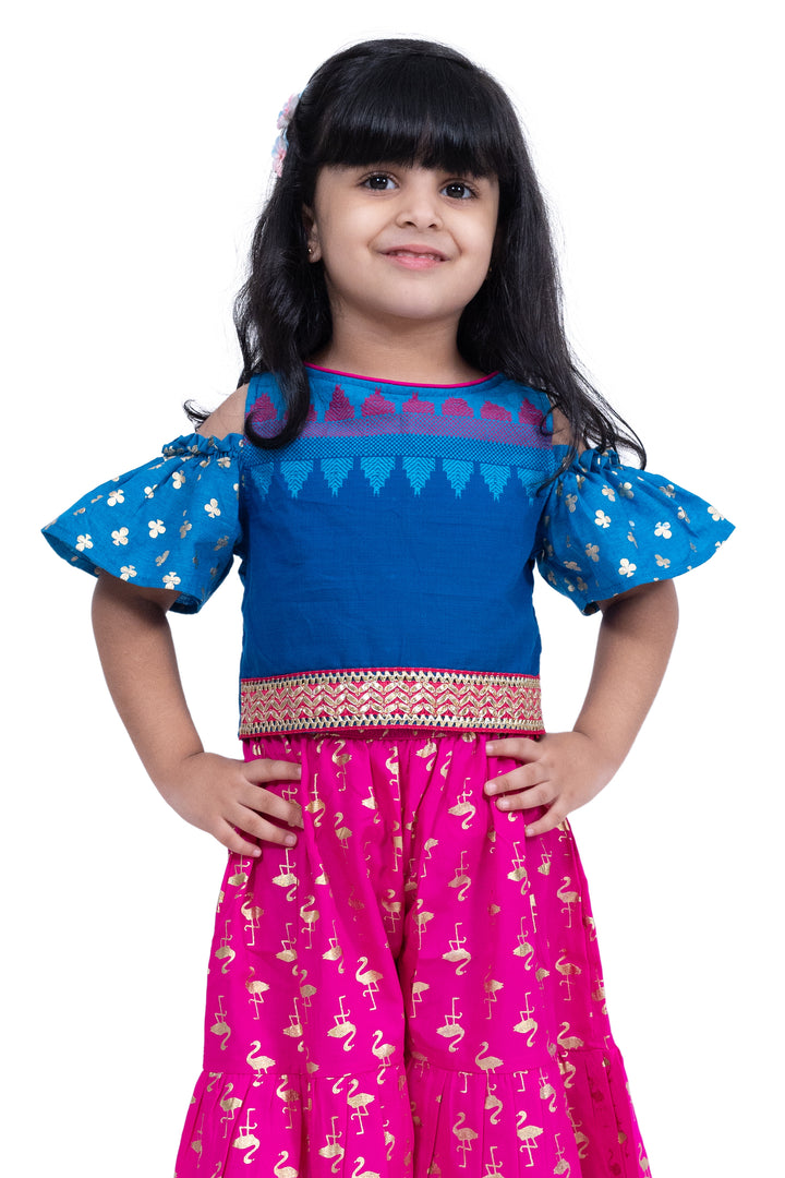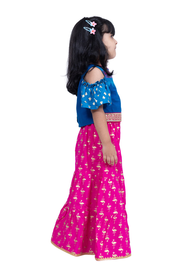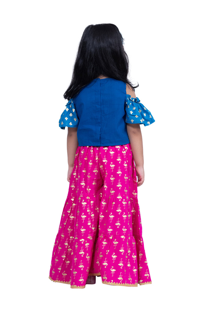 Twisha Girls Cotton Cold Shoulder Half n Half Bordered Top With Sharara - Blue & Pink