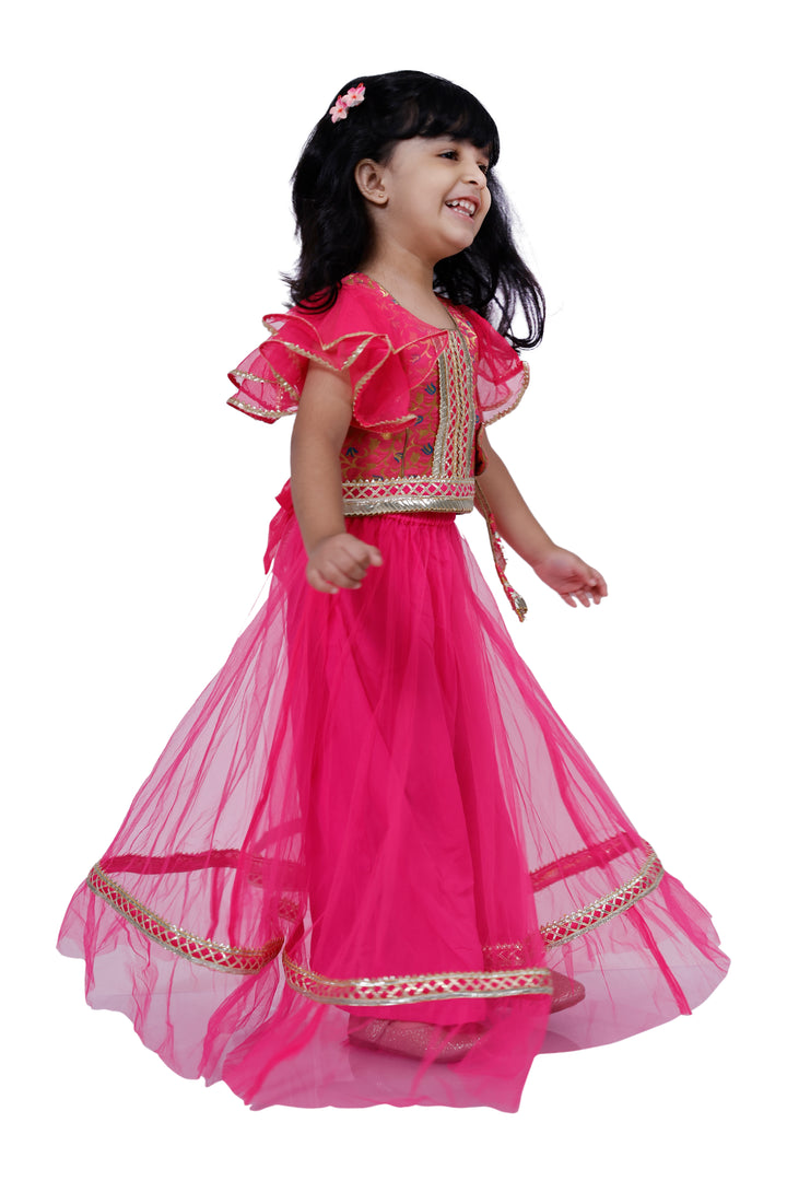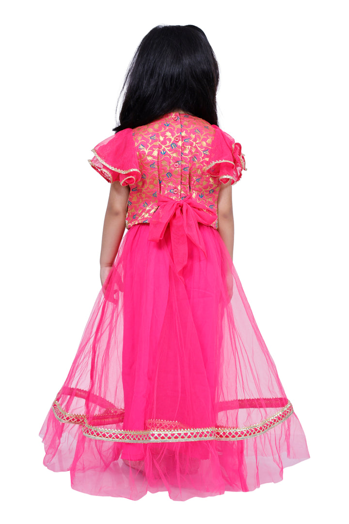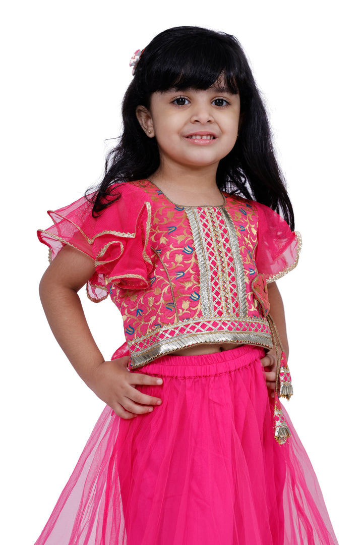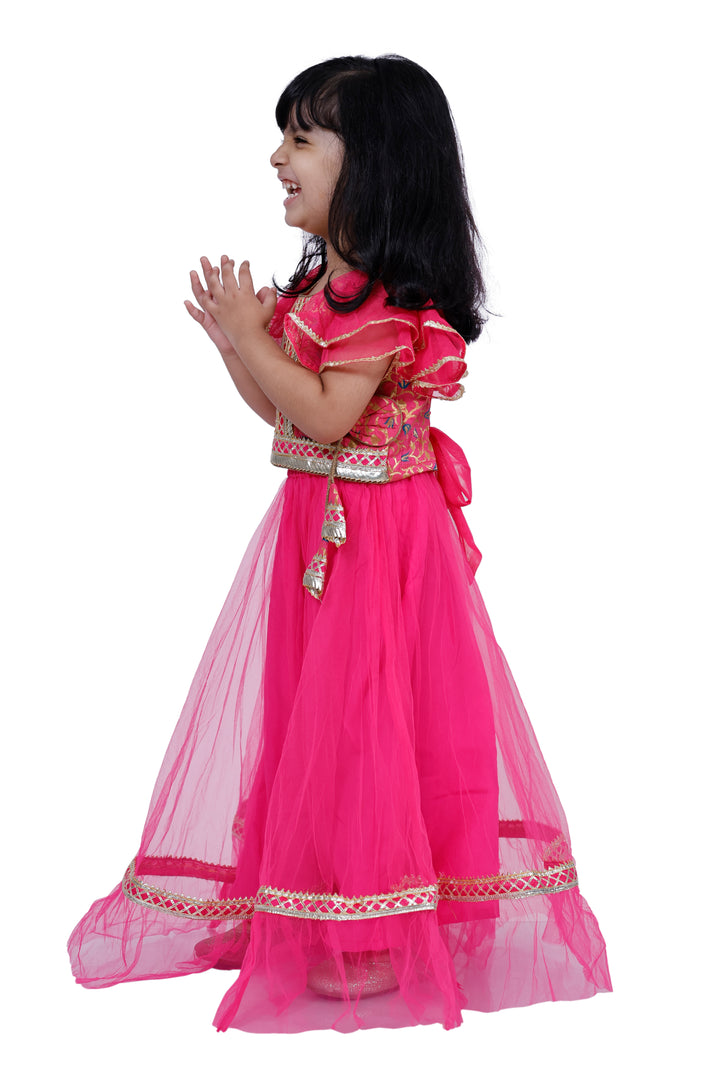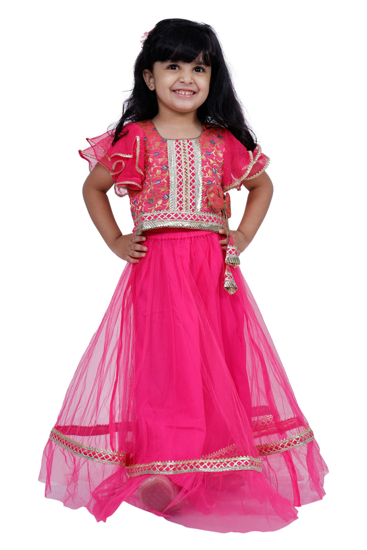 Twisha Girls Brocade Woven Half Sleeves Embellished Top with Net Lehenga-Pink