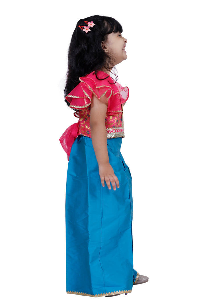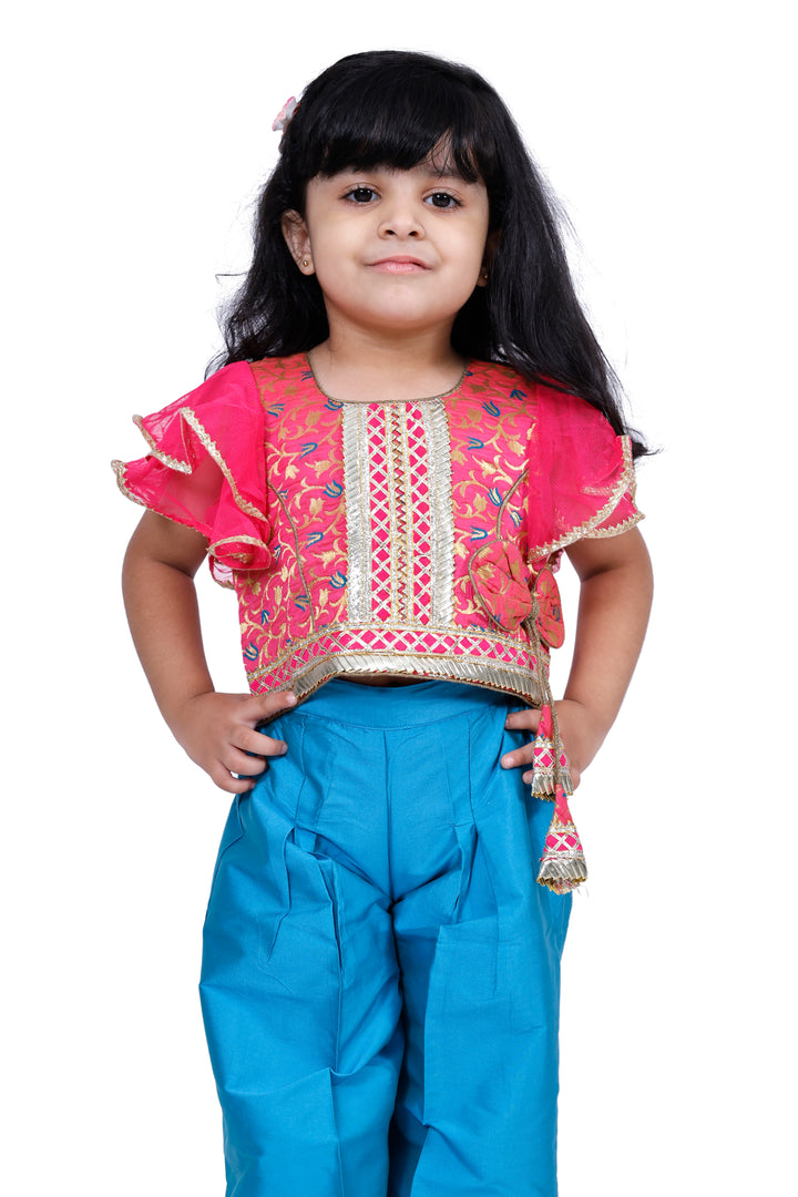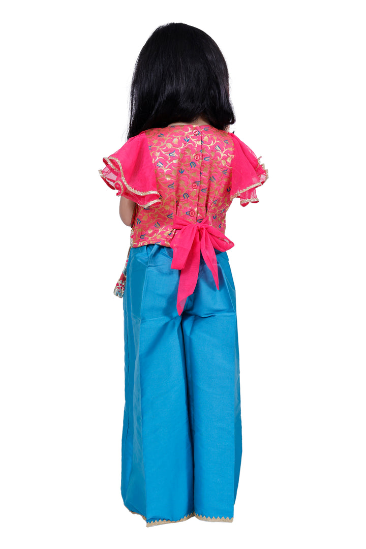 Twisha Girls Brocade Woven Half Sleeves Embellished Top with Palazzo-Pink & Blue