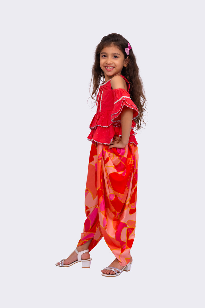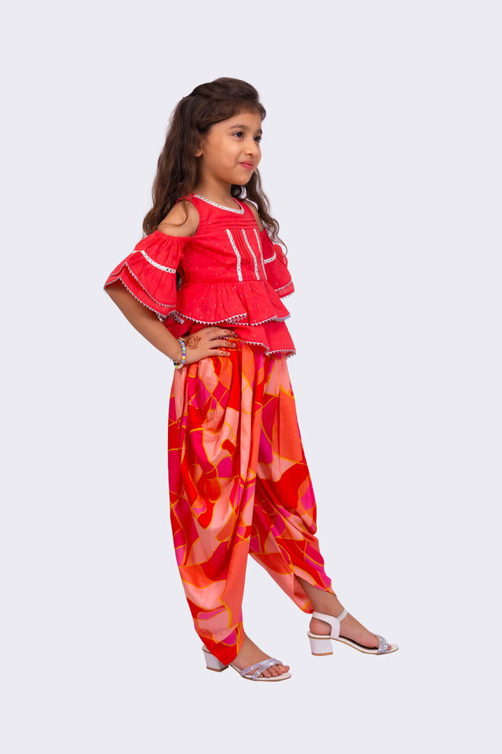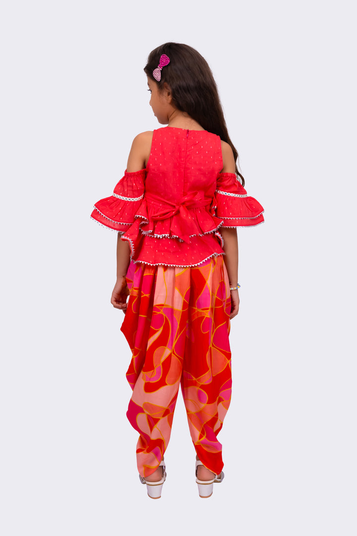 Twisha Girls Cotton Jacquard Woven 3/4 Sleeves Embellished Top With Printed Dhoti-Coral