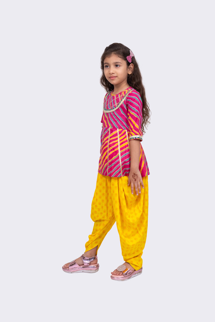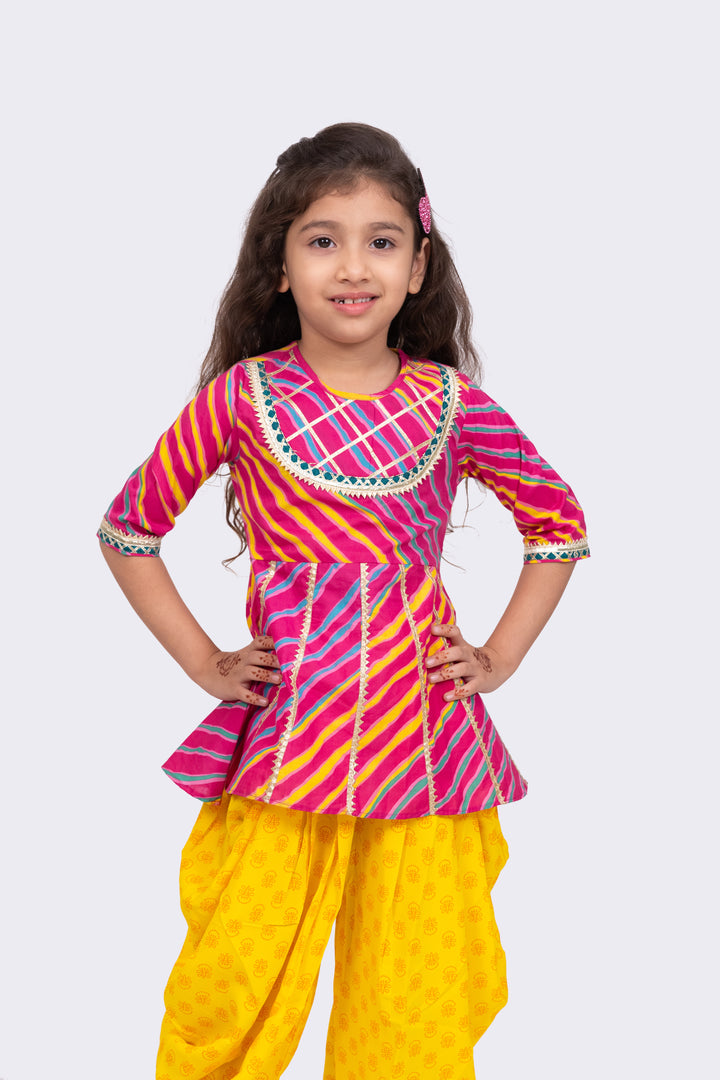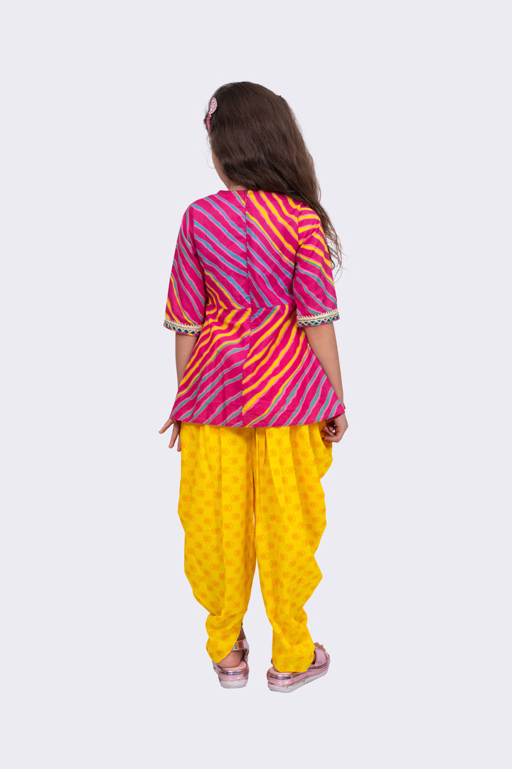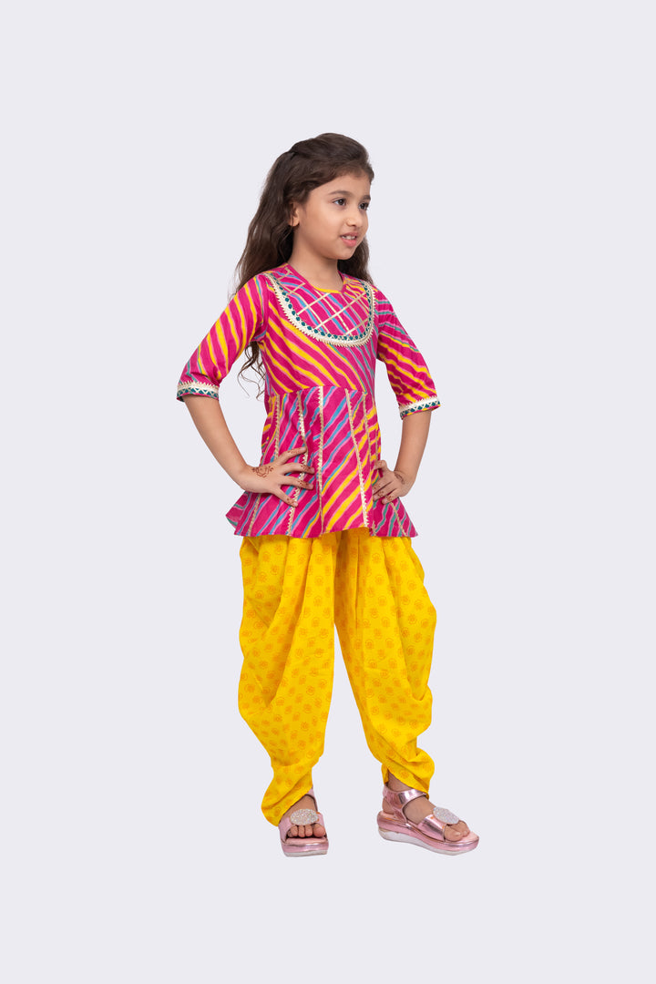 Twisha Girls Cotton Woven 3/4 Sleeves All Over Leheriya Print Top With Printed Dhoti-Pink & Purple