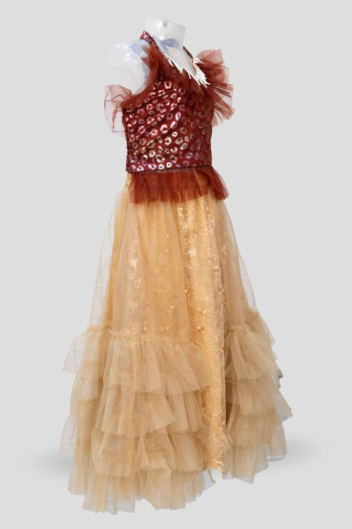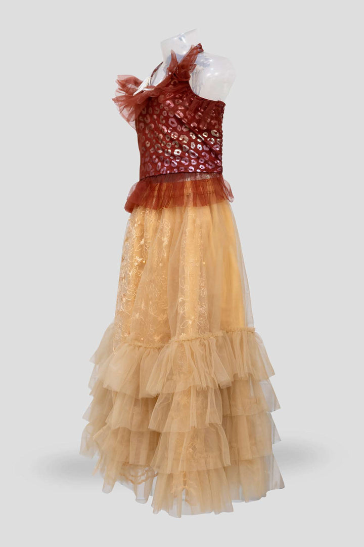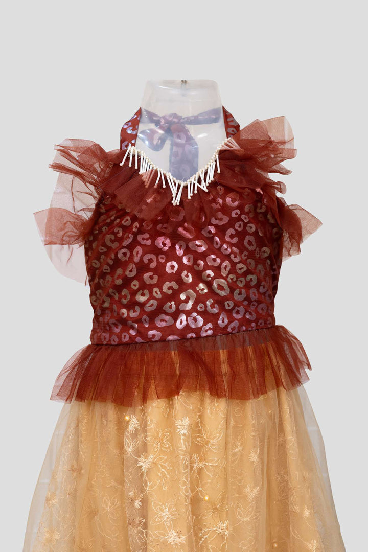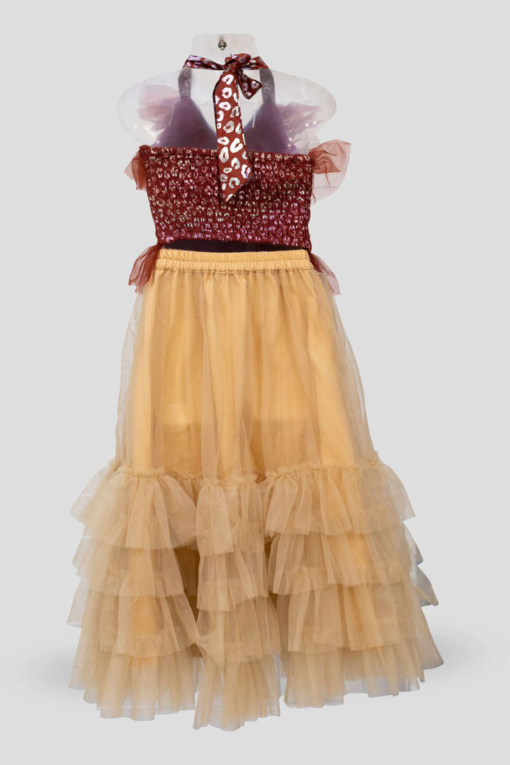 Twisha Girls Halter Frilled Top with Layered Lehenga-Brown & Biege