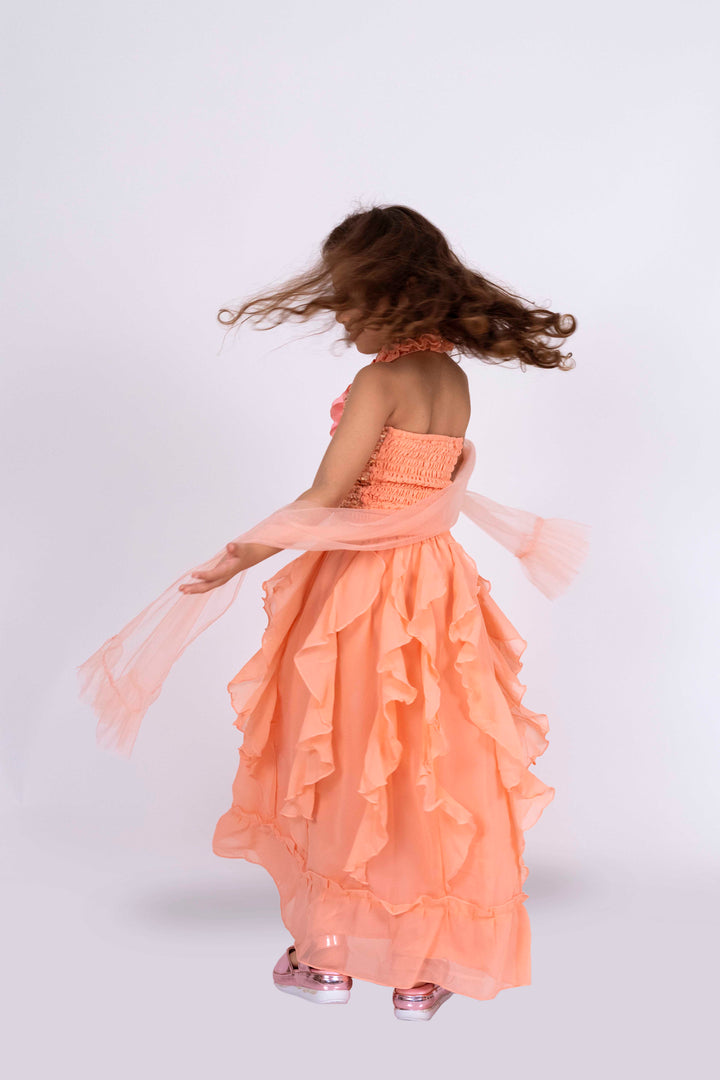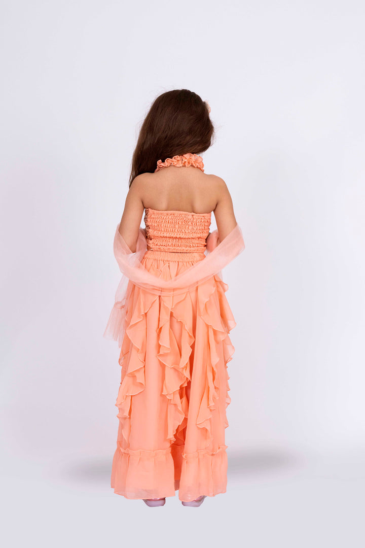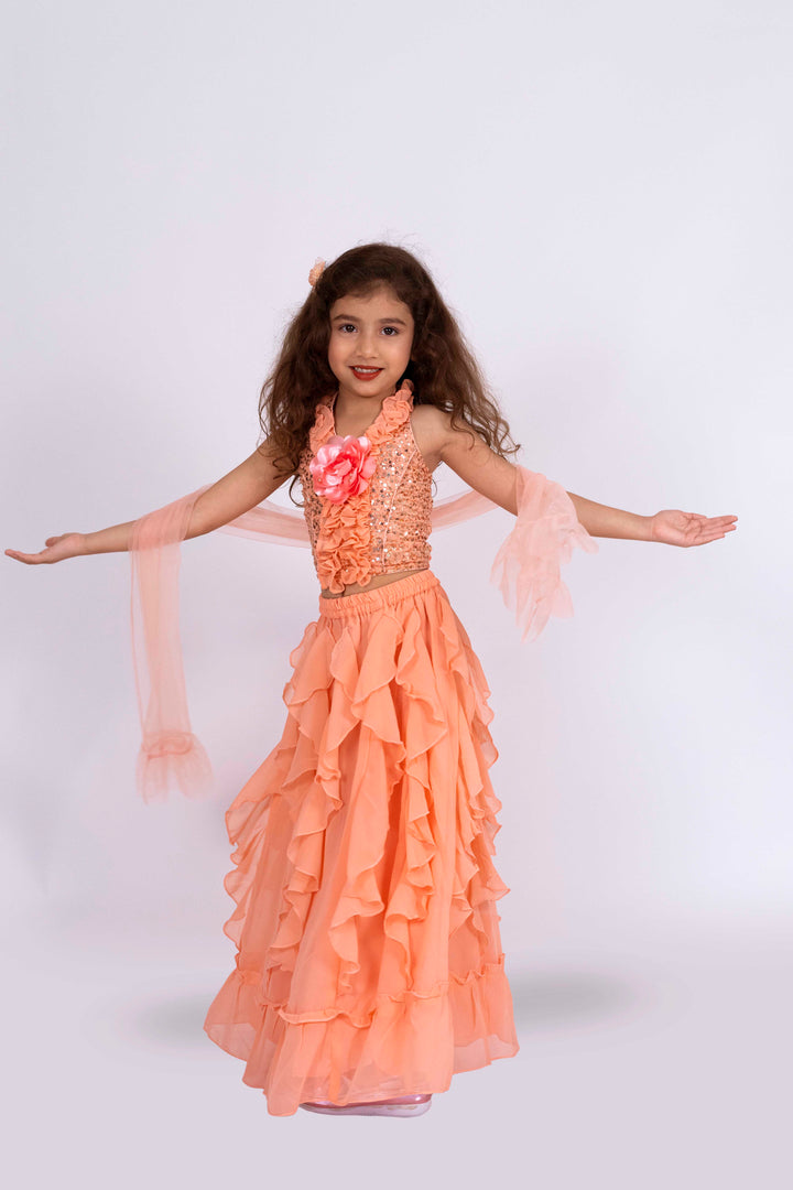 Twisha Girls Halter Neck Frilled Top with Lehenga-Peach