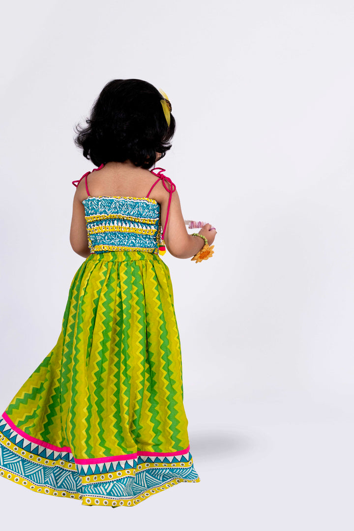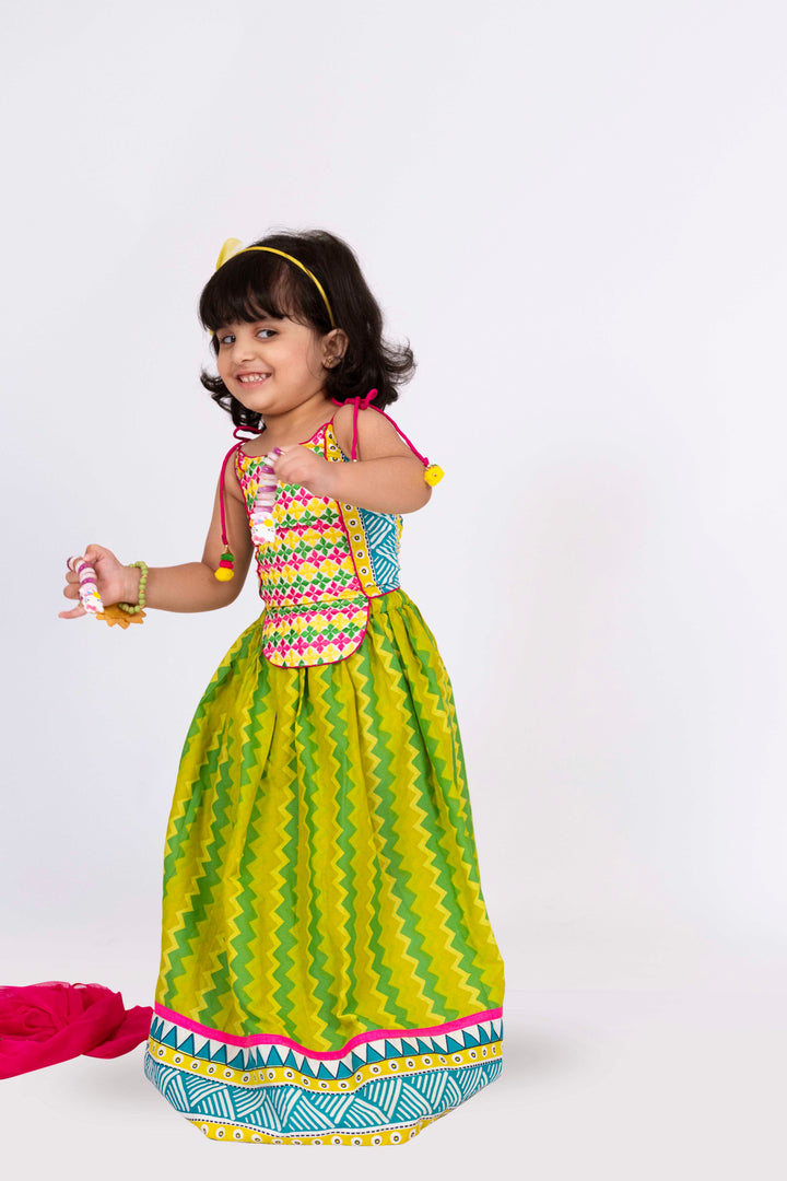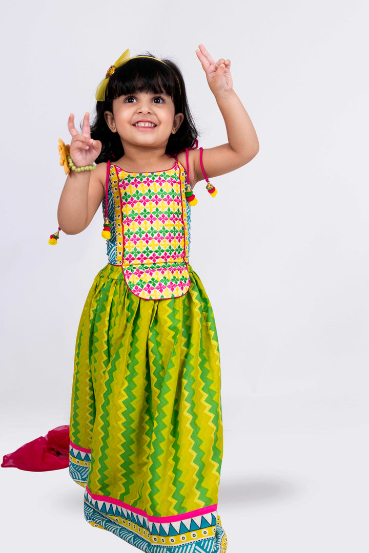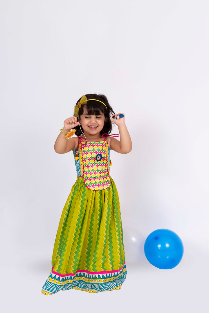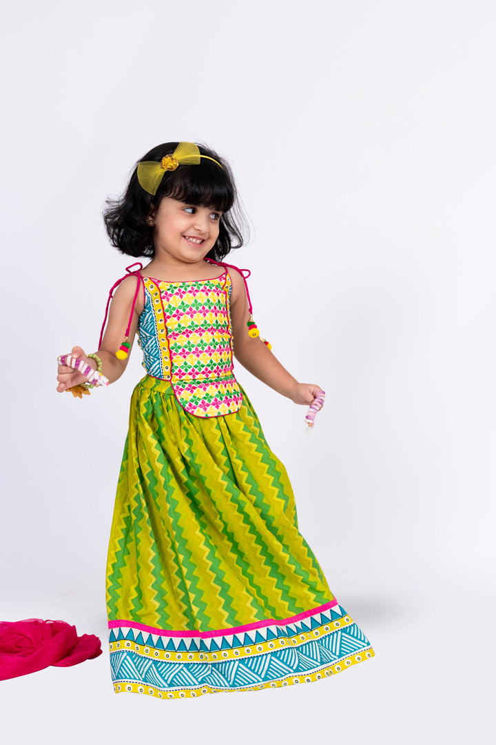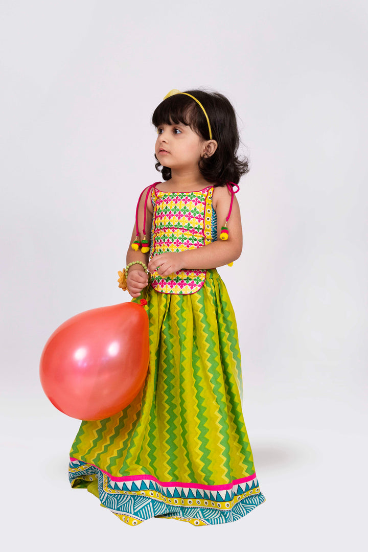 Twisha Girls Sleeveless Embroidered Top With Lehenga Set - Lime Green & White
