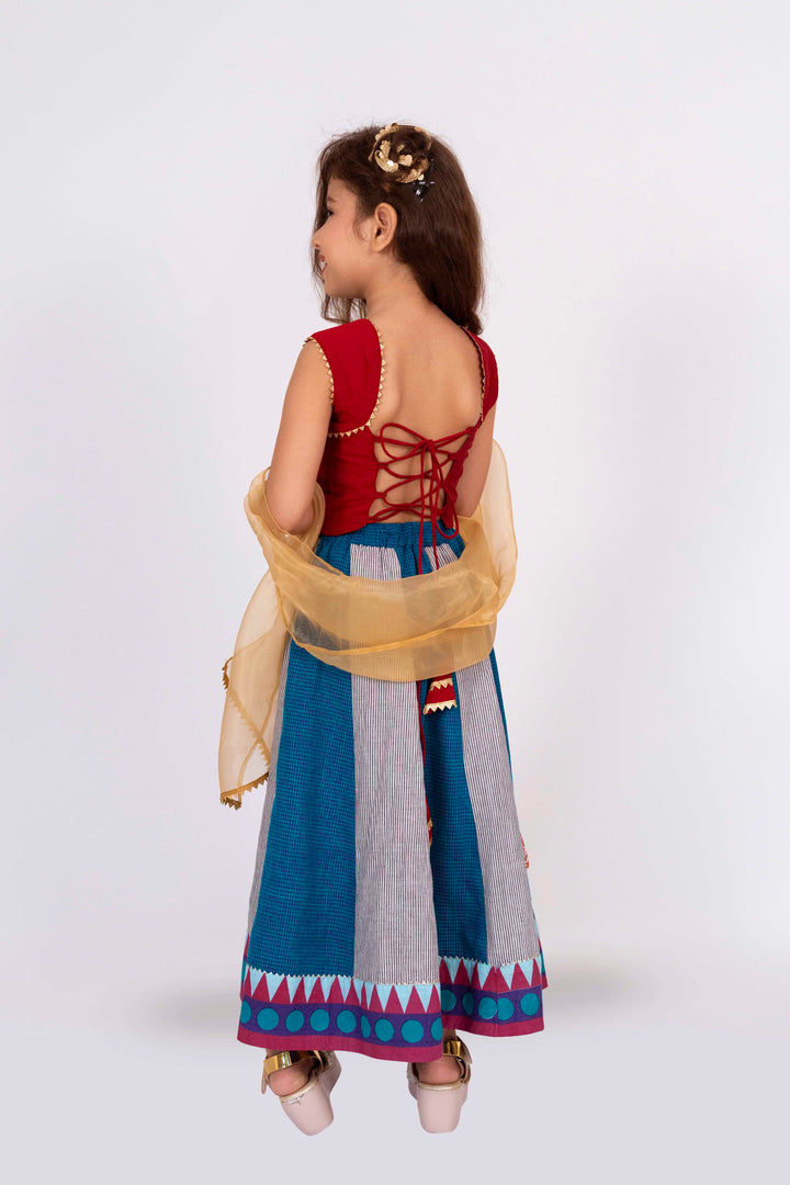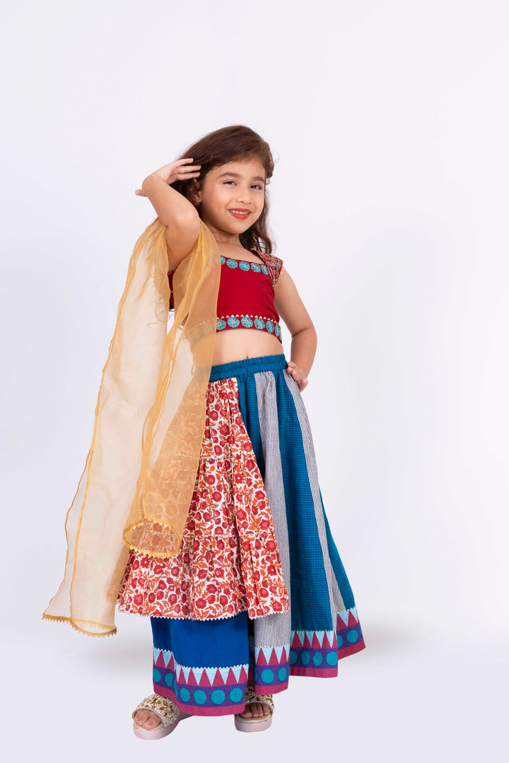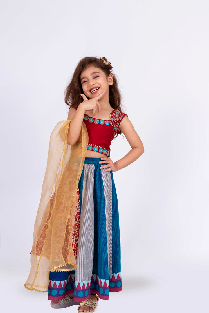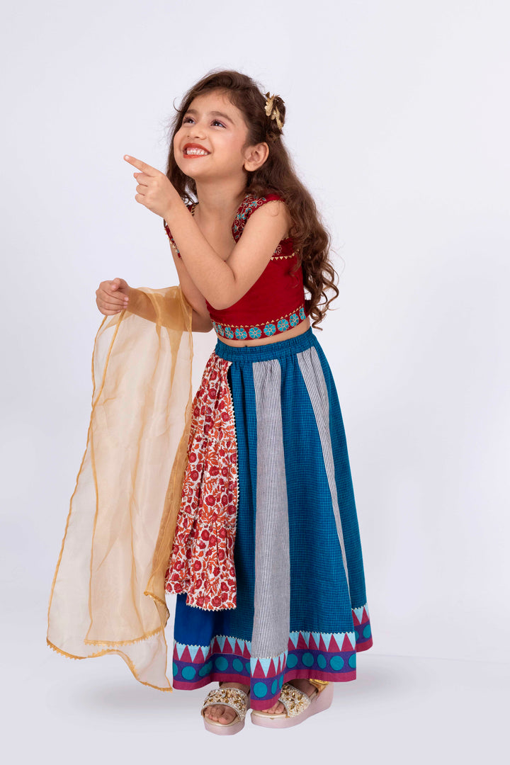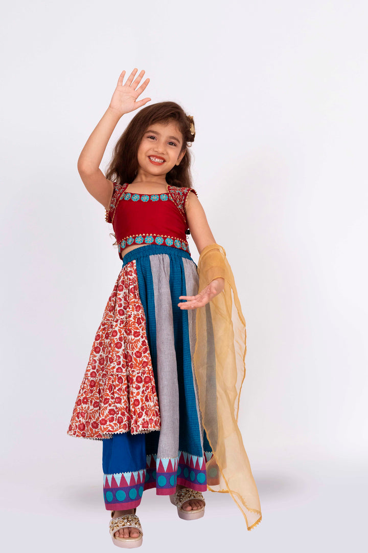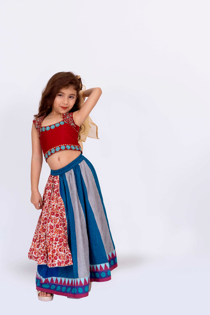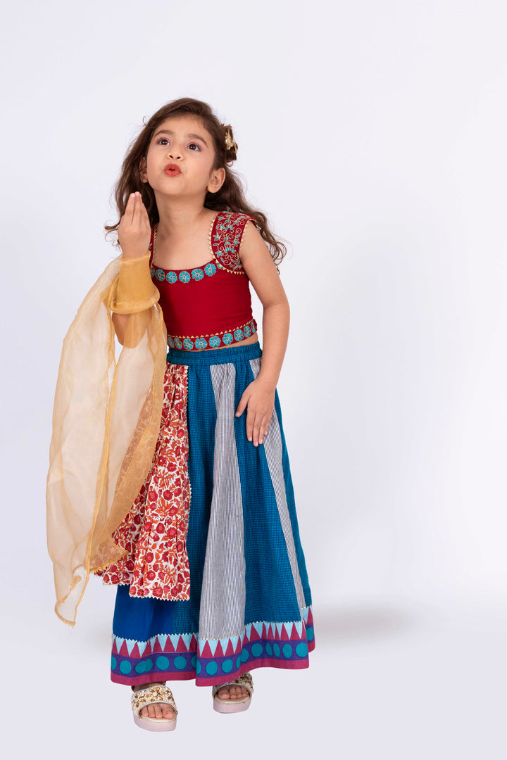 Twisha Girls sleeveless Embroidered Top With Layered Lehenga Set - Maroon & Blue