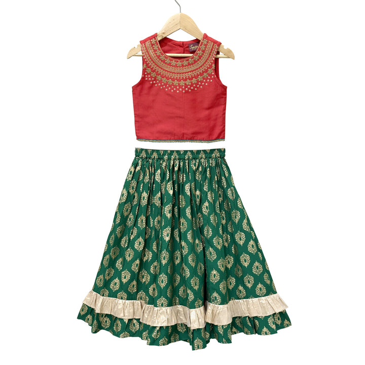 Twisha Woven Sleeveless Placement Embroidered Top With Printed Lehenga-Red & Green