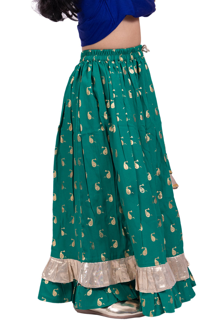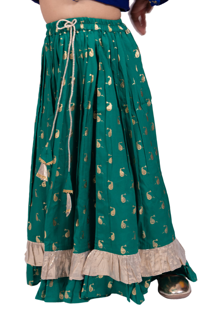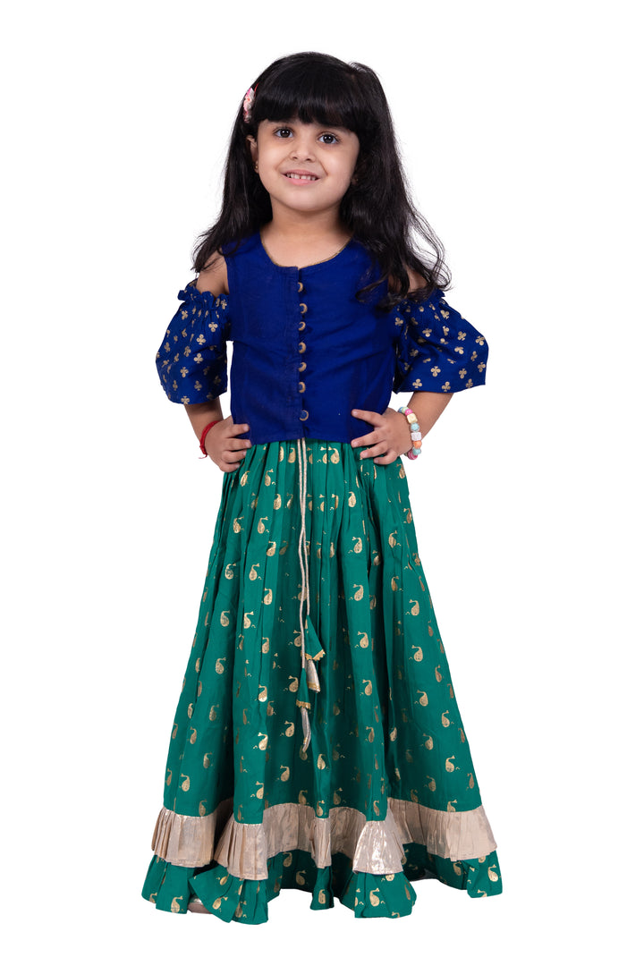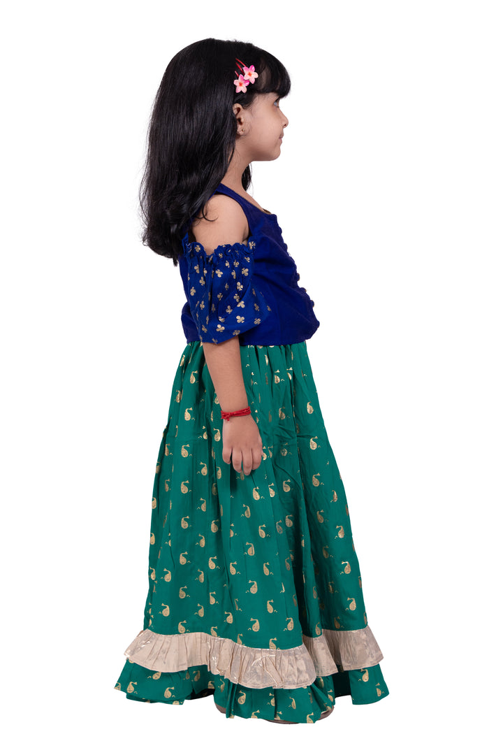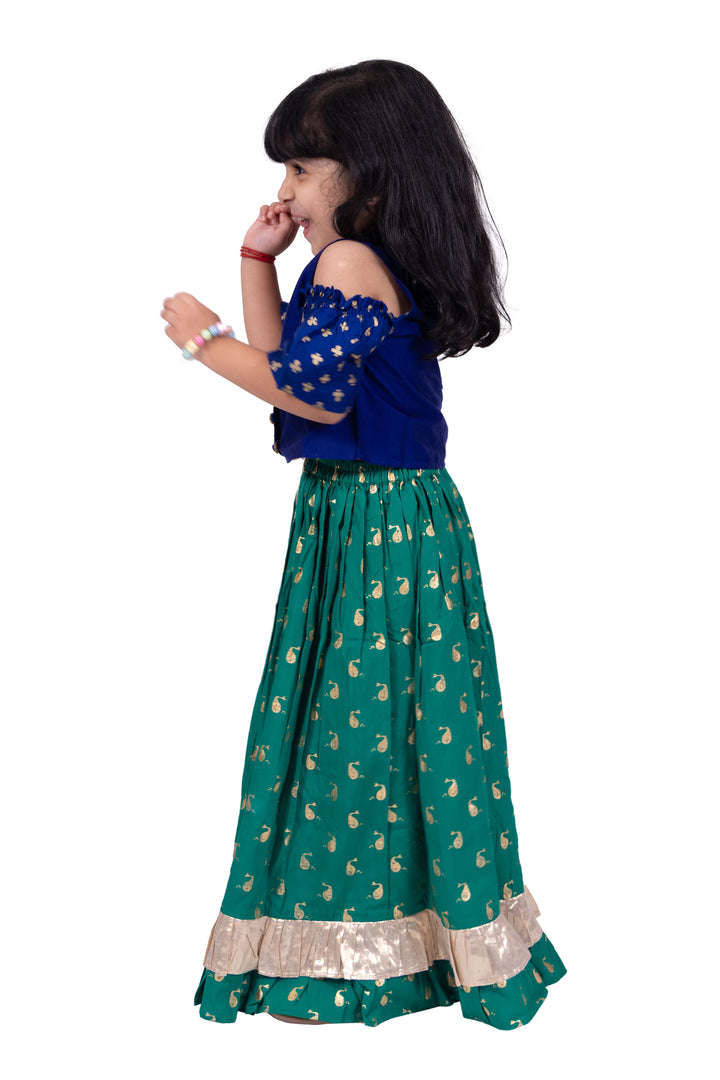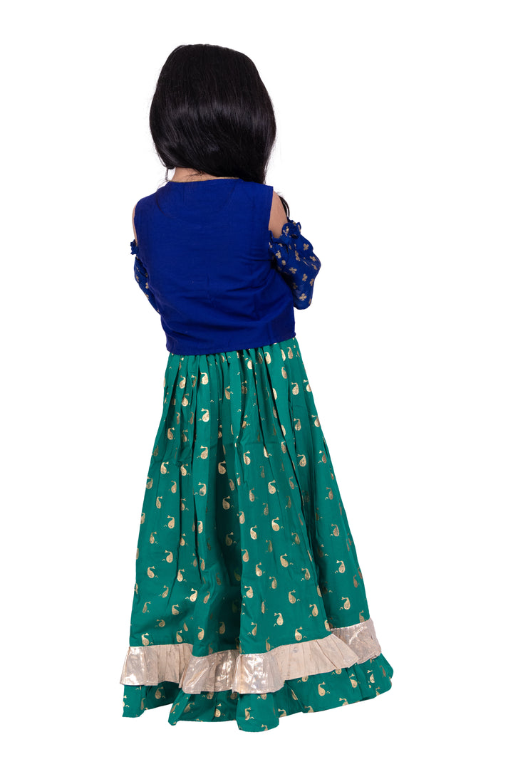 Twisha Girls Half Sleeves All Over Printed Top & Lehenga-Blue & Green