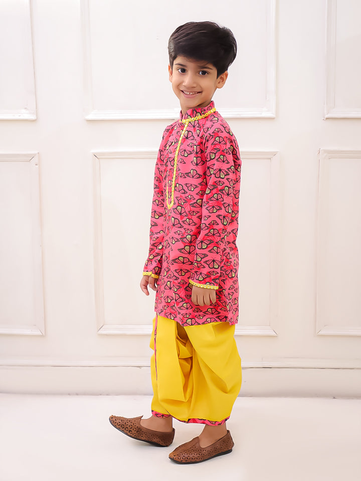 Twisha Boys Rayon Fullsleeves Butterfly Printed kurta with Dhoti - Coral & Yellow