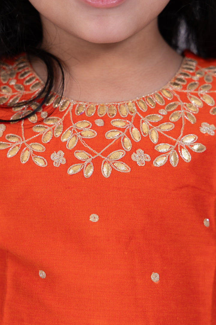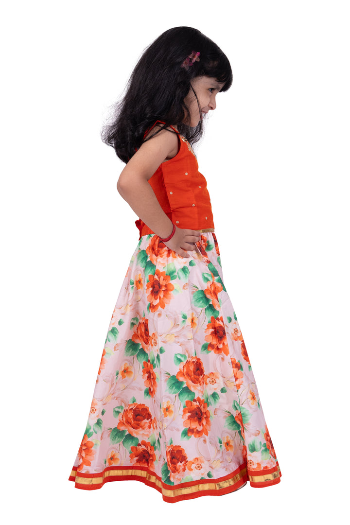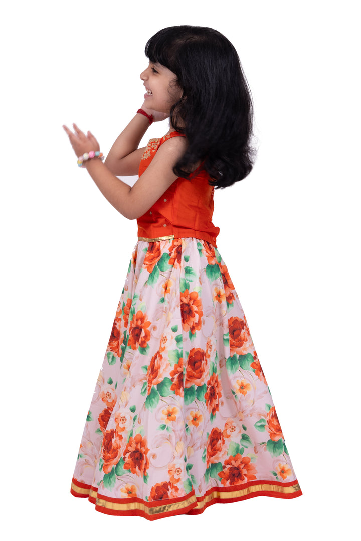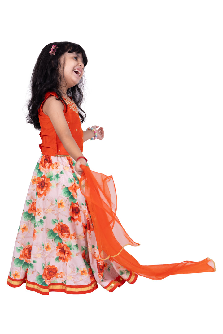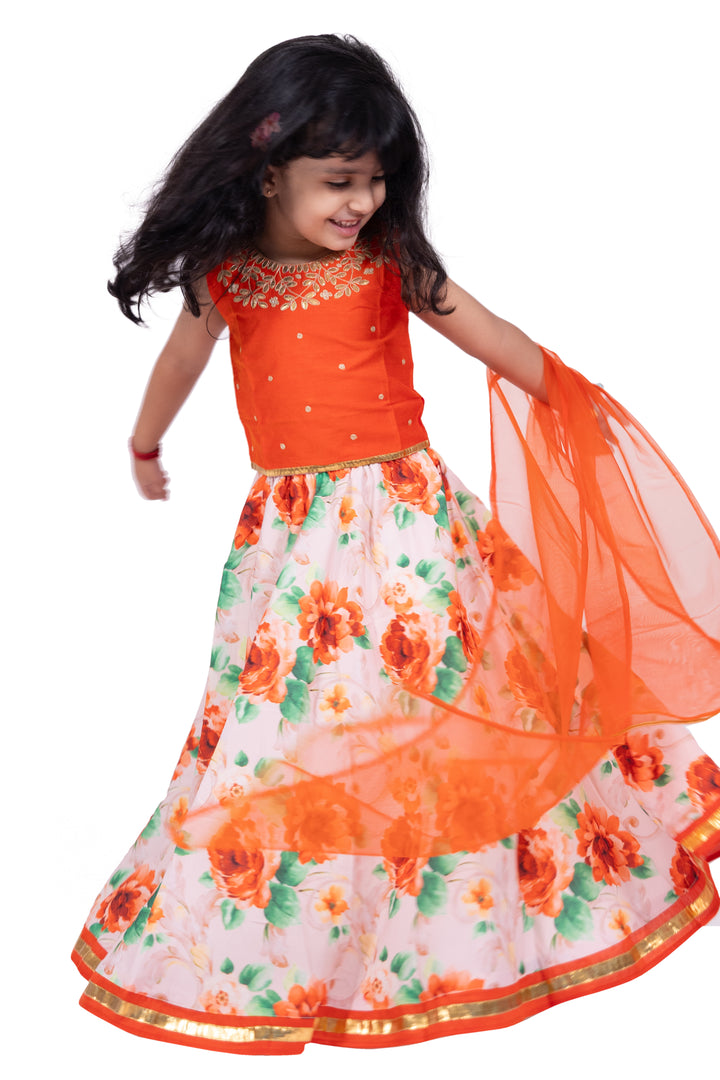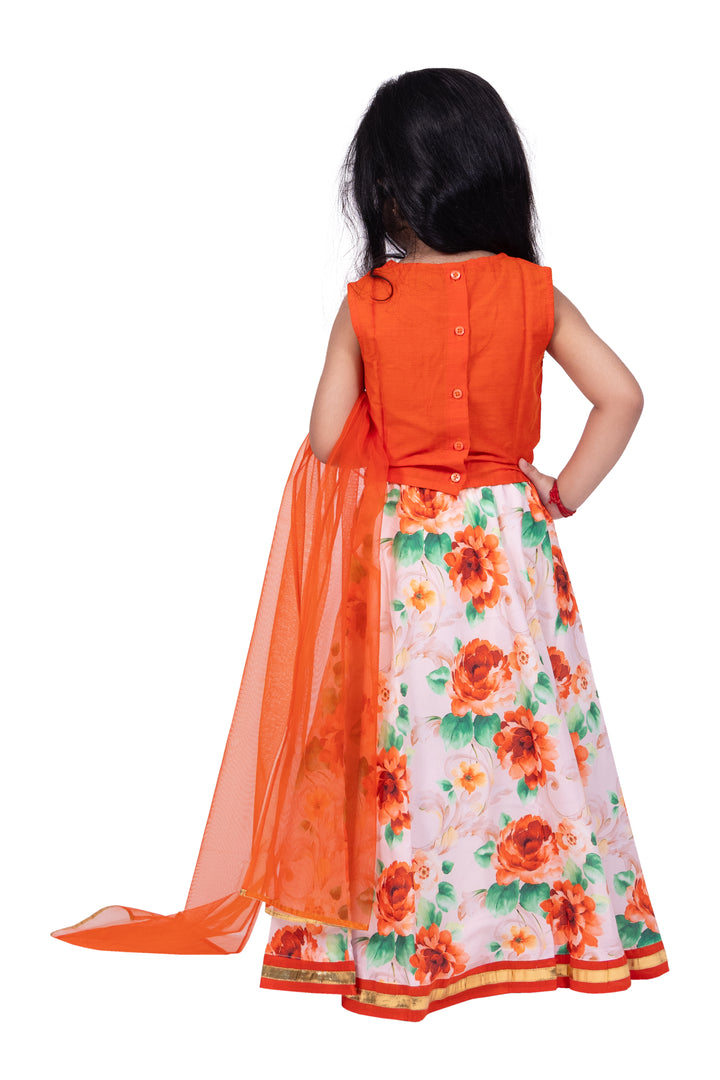 Twisha Girls Sleeveless Embellished Top With Printed Lehenga & Dupatta- Orange & White