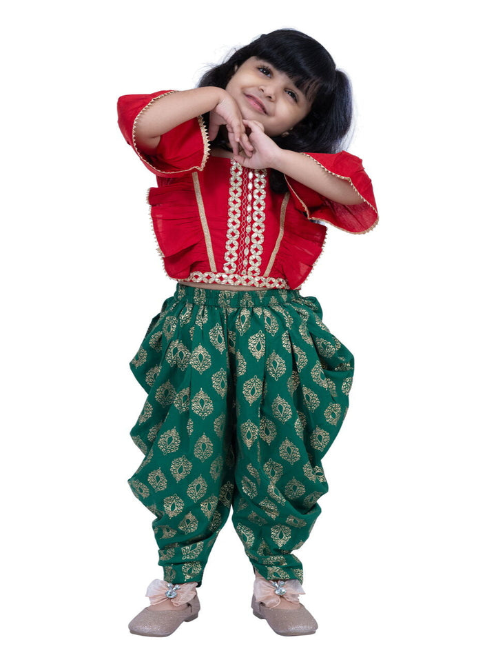 Twisha Girls Three Quarter sleeves Embelliished Top With Printed Dhoti - Red & Green